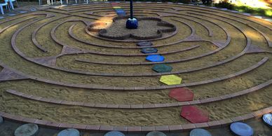 Our Seven Path Labyrinth is a walking meditation. In the center of our labyrinth is a pole with a representation of the universe above and the earth below. The pole represents ourselves as a conduit between heaven and earth. Around the pole are six 'petals' representing: the mineral kingdom, plant kingdom, animal kingdom, humans, angels, and the Great Mystery. At the outer edge of the labyrinth are the phases of the moon. There is a unique meditation that aligns with the rainbow stepping stones that Charlynn can share with you.