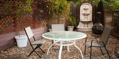 Our Private Garden Patio is entered from three of our rooms; the Mountain, Zen Garden, and Spring Blossom Rooms. There is also a gate from the side drive. Each room has its own bistro set area for quiet personal time. We have a large table set up here for groups or personal eating, relaxing, journaling or just hanging out. Our 3-tiered fountain cascades an aqua melody that helps the mind relax. We have a bird feeder and bath that invites our feathered friends. Local lizards and shy house kitties also nap here. Peace abounds and helps us to unwind and chill out.
